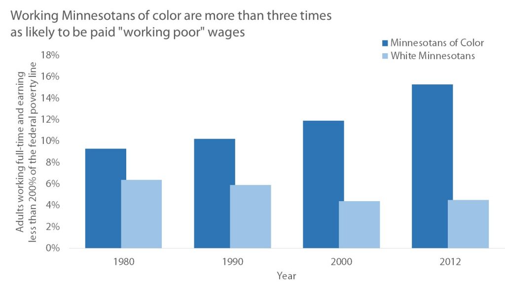 A new analysis from PolicyLink and the University of Southern California Program for Environmental and Regional Equity shows that working Minnesotans of color were 50 percent more likely to be considered “working poor” in 2012 than they were in 1980. Over the same time frame, the percentage of white working Minnesotans in the same category actually decreased.