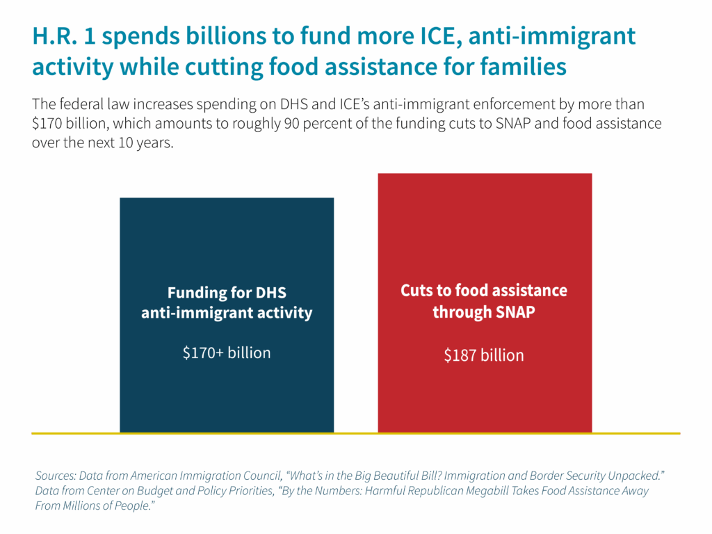 On July 4, 2025, President Donald Trump signed into law H.R. 1, also known as the One Big Beautiful Bill Act (OBBBA), which cut hundreds of billions of dollars from Medicaid and SNAP, our country’s core basic needs programs. These cuts paid primarily for two things: 1) a tax package that gives the biggest tax cuts to the nation’s wealthiest, and 2) an extreme spending increase on immigration enforcement.
