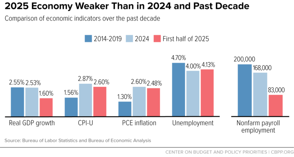 Besides GDP, other economic indicators are also showing softening. U.S. payroll employment has slowed, in significant part because of Trump Administration immigration policy. Forecasts for business investment and consumer spending, when they’re adjusted for inflation, are also expected to weaken compared to the beginning of the year. Overall, today’s “split economy” is one in which higher-income Americans continue to do well while affordability challenges are top of mind for most everyday American workers and consumers.